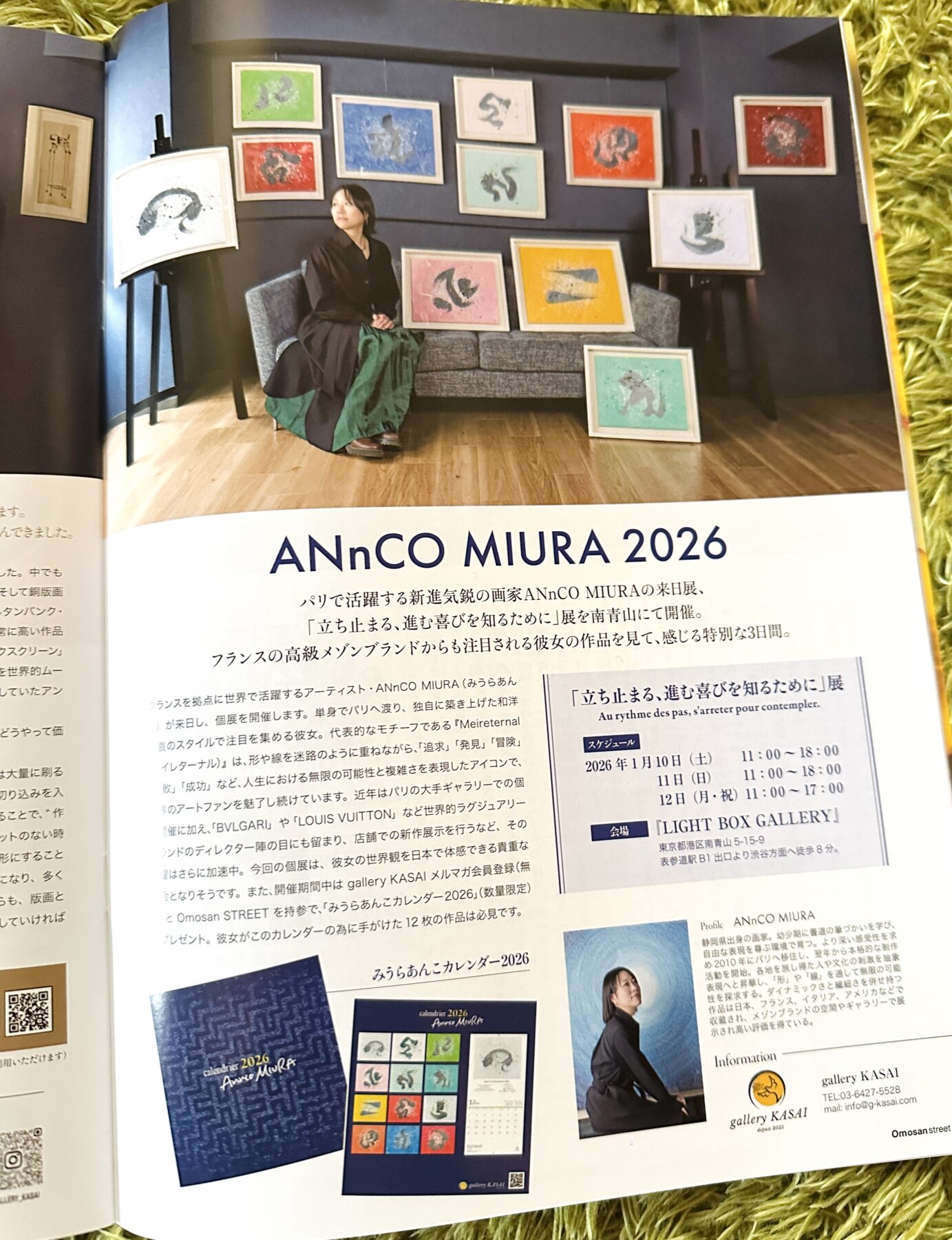 My upcoming solo exhibition has been featured in the 100th Anniversary Issue of Omosan, a magazine distributed in the Omotesando, Harajuku, and Aoyama areas.